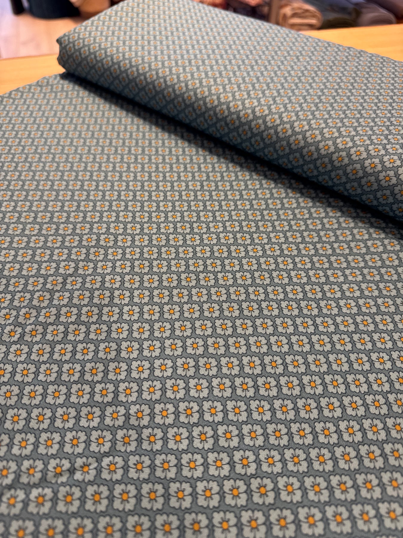 140cm bredde. Vi anbefaler at du vasker stoffet før du syr. Kan krympe litt i vask.